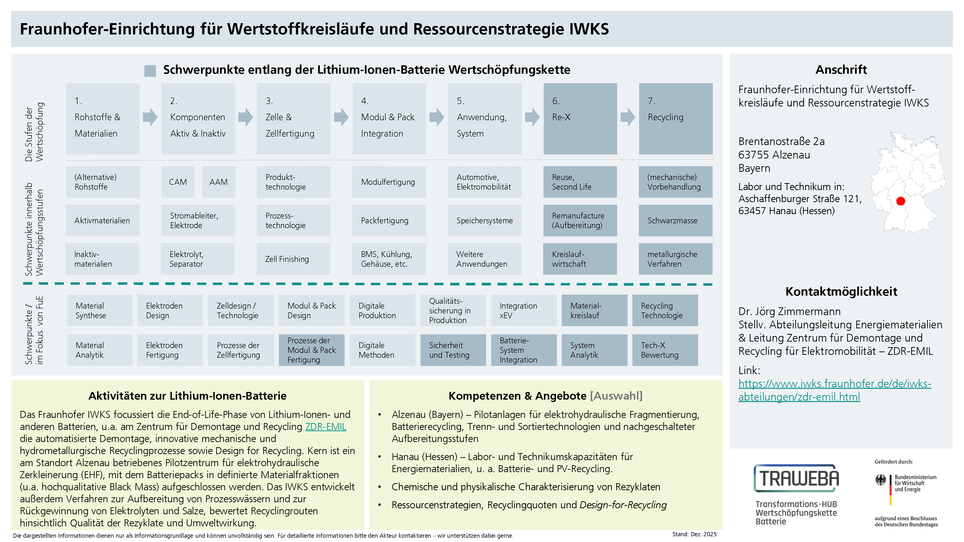 Das Fraunhofer IWKS legt den Schwerpunkt der Forschungsarbeiten auf die Etablierung einer geschlossenen Kreislaufwirtschaft: Die Abfälle von heute sind die Ressourcen von morgen. Wertvolle Rohstoffe können zurückgewonnen und wiederverwertet oder aber durch nachhaltige, umwelt- und sozialverträglichere Alternativen ersetzt werden. Im Batteriebereich fokussiert sich das Fraunhofer IWKS auf die Demontage, das (hydro-)mechanische und hydrometallurgische Recycling der Schwarzmasse sowie direktes Recycling, begleitet durch umfassende Materialanalytik, LCA, LCC und Prozessoptimierung.