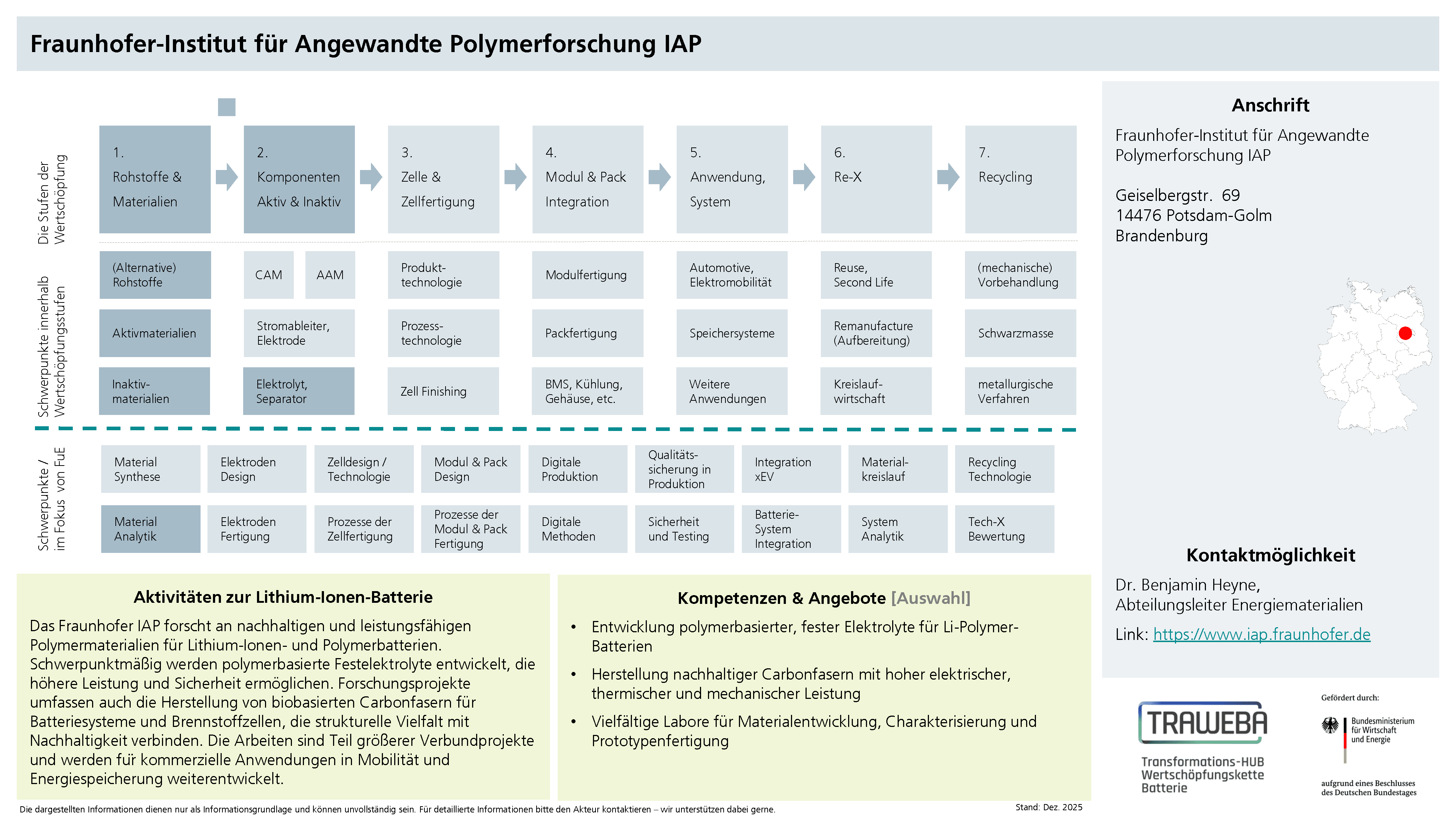 In der Fraunhofer-Allianz Batterien bündeln derzeit 26 Institute ihre Expertise im Batteriebereich. Damit bietet die Allianz eine Ansprechebene, welche gezielt auf Kundenbedürfnisse abgestimmt ist, und ermöglicht den Weg zu entsprechenden Experten und ganzheitlichen Lösungen innerhalb der Fraunhofer-Gesellschaft zu finden.