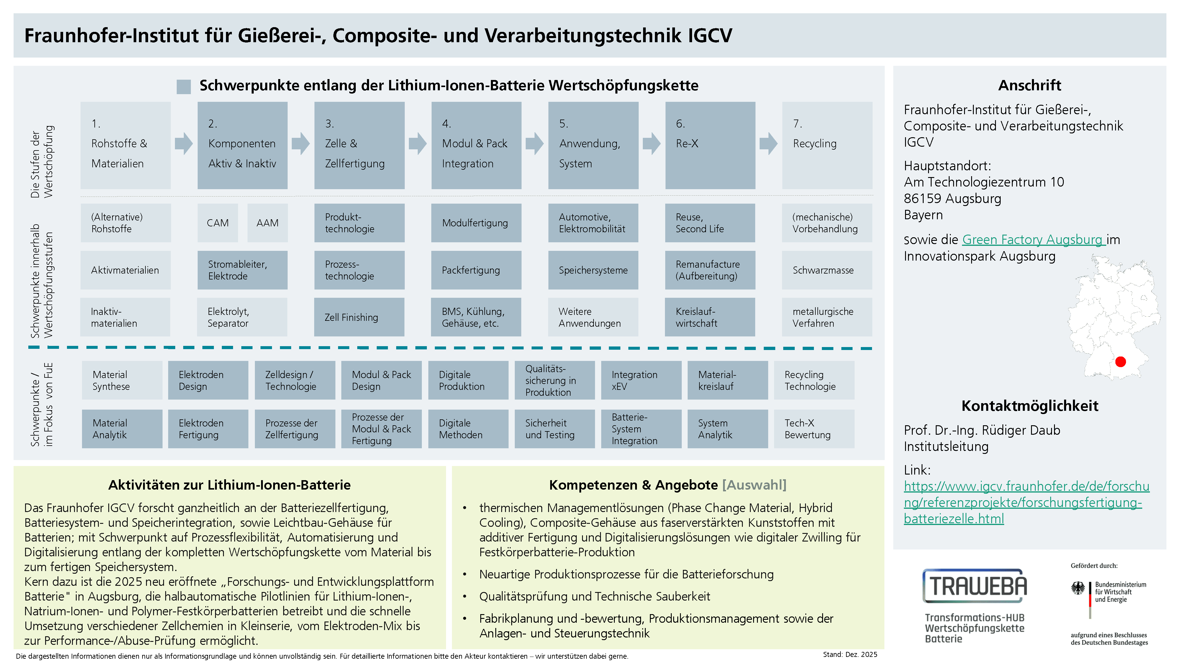 Das Fraunhofer IGCV beschäftigt sich im Batteriebereich mit der Material- und Prozessforschung für Lithium-Ionen-Batterien, Natrium-Ionen-Batterien und Festkörperbatterien, sowie der Entwicklung und Prüfung von Zellen, Modulen und Systemen. Im Rahmen einer flexiblen Produktions- und Testplattform werden Standards bei der Produktion und Automatisierung von Energiespeichersystemen entwickelt. Neben der Zellproduktion verschiedener Zelltypen wird dabei ebenso die Weiterverarbeitung zu Batteriemodulen und -packs betrachtet. Darüber hinaus werden die Zellen und Module in Abusetests auf ihre Sicherheit hin überprüft.