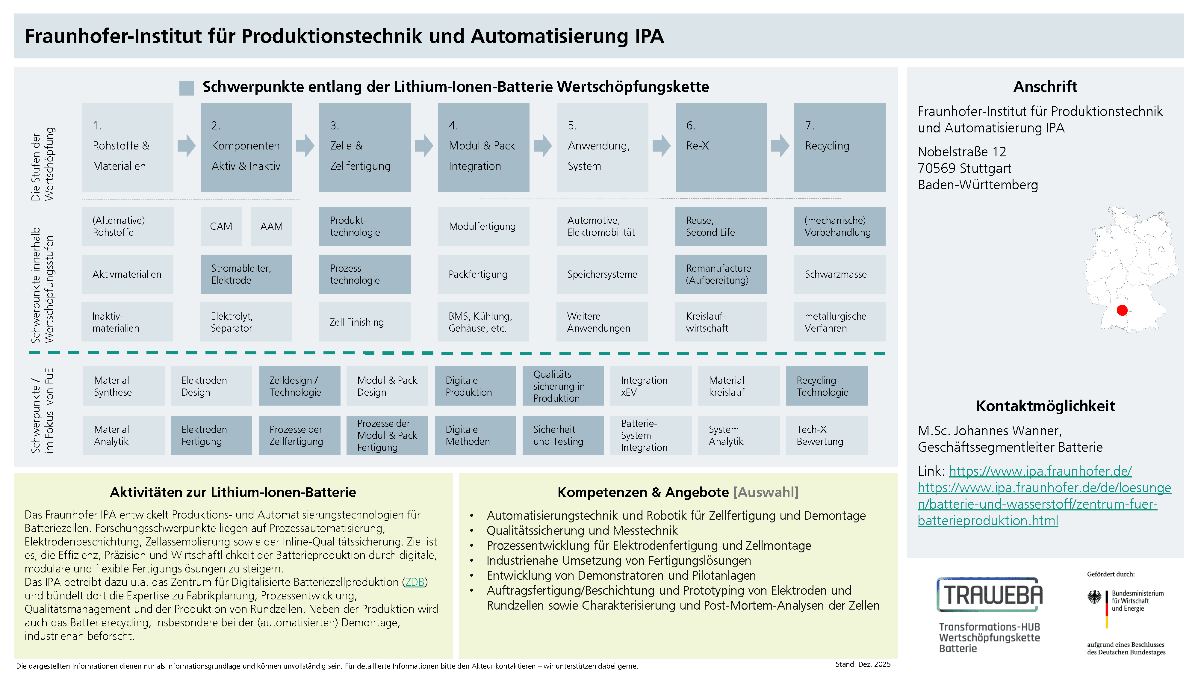 Das Fraunhofer IPA ist Mitgliedsinstitut in der Fraunhofer-Allianz Batterien und trägt damit einen entscheidenden Beitrag zum Batterie-Ökosystem der Fraunhofer-Gesellschaft bei.