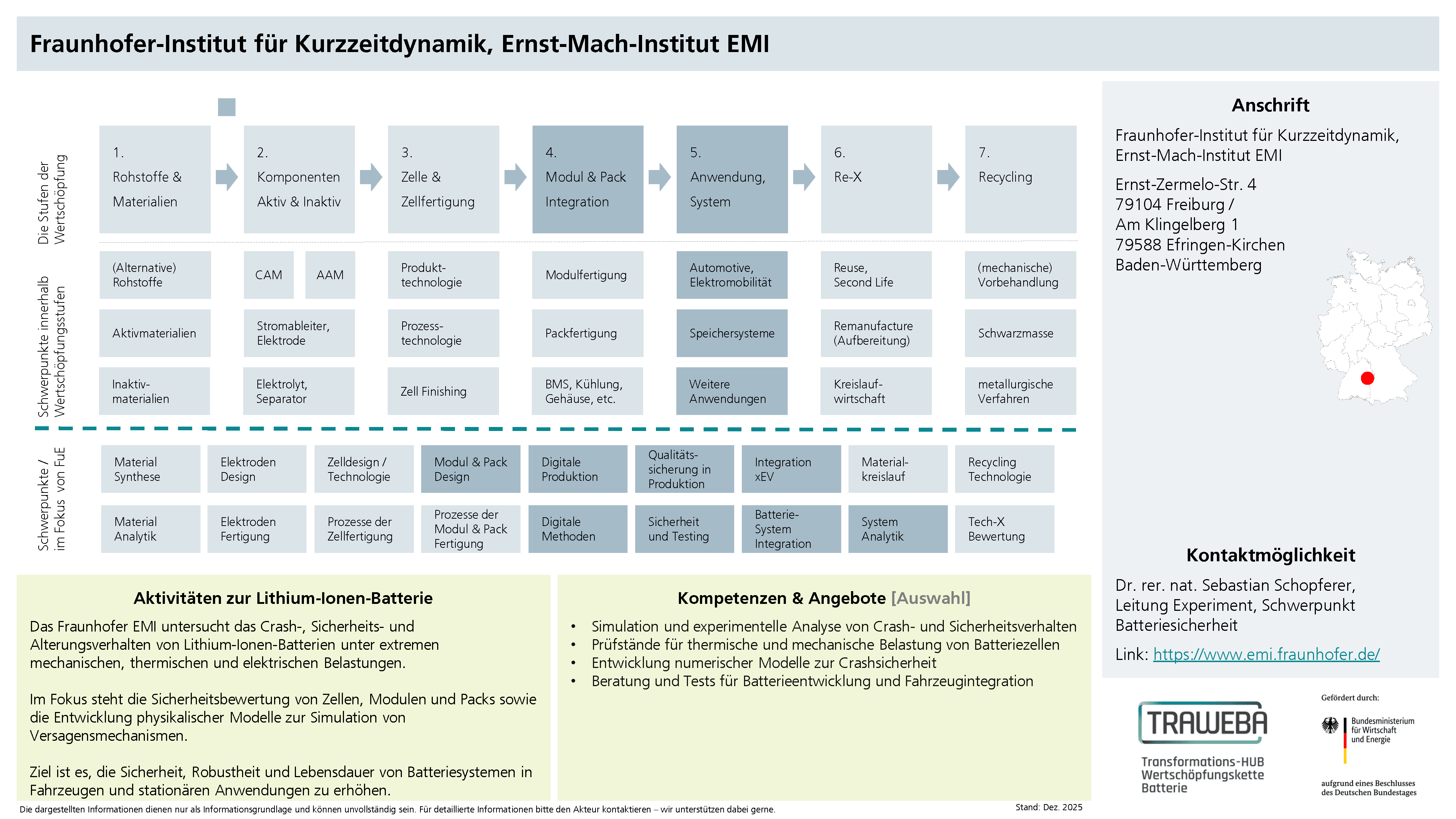 Das Fraunhofer EMI erforscht schnell ablaufende Prozesse in Experiment und Simulation und bietet Lösungen für industrielle Anwendungen an mit dem Fokus auf Zuverlässigkeit, Sicherheit, Resilienz, Effizienz und Nachhaltigkeit. Im Batteriebereich beschäftigt sich das Fraunhofer EMI mit der Untersuchung dehnratenabhängiger Effekte bei mechanischem Abuse bis zur Modulebene sowie Crashmodellierung von Zellen und Modulen. Es werden darüber hinaus werkstoffübergreifend Crash-, Impakt- und Stoßwellenphänomene behandelt sowie Systeme analysiert und optimiert.