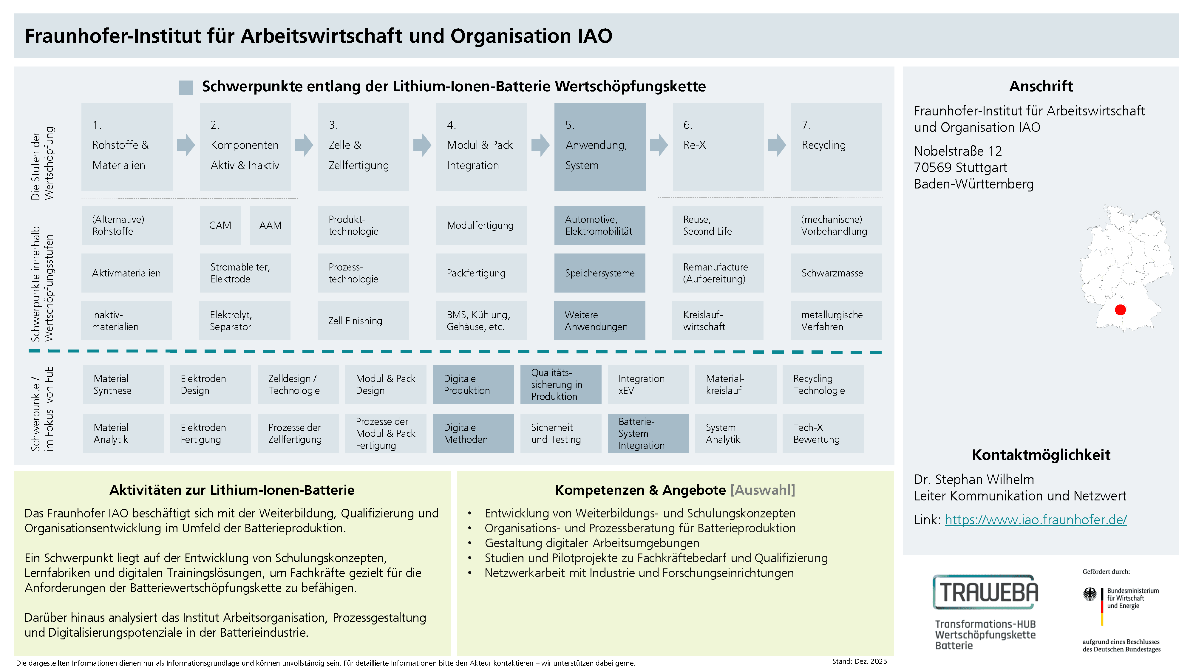 In der Fraunhofer-Allianz Batterien bündeln derzeit 26 Institute ihre Expertise im Batteriebereich. Damit bietet die Allianz eine Ansprechebene, welche gezielt auf Kundenbedürfnisse abgestimmt ist, und ermöglicht den Weg zu entsprechenden Experten und ganzheitlichen Lösungen innerhalb der Fraunhofer-Gesellschaft zu finden.