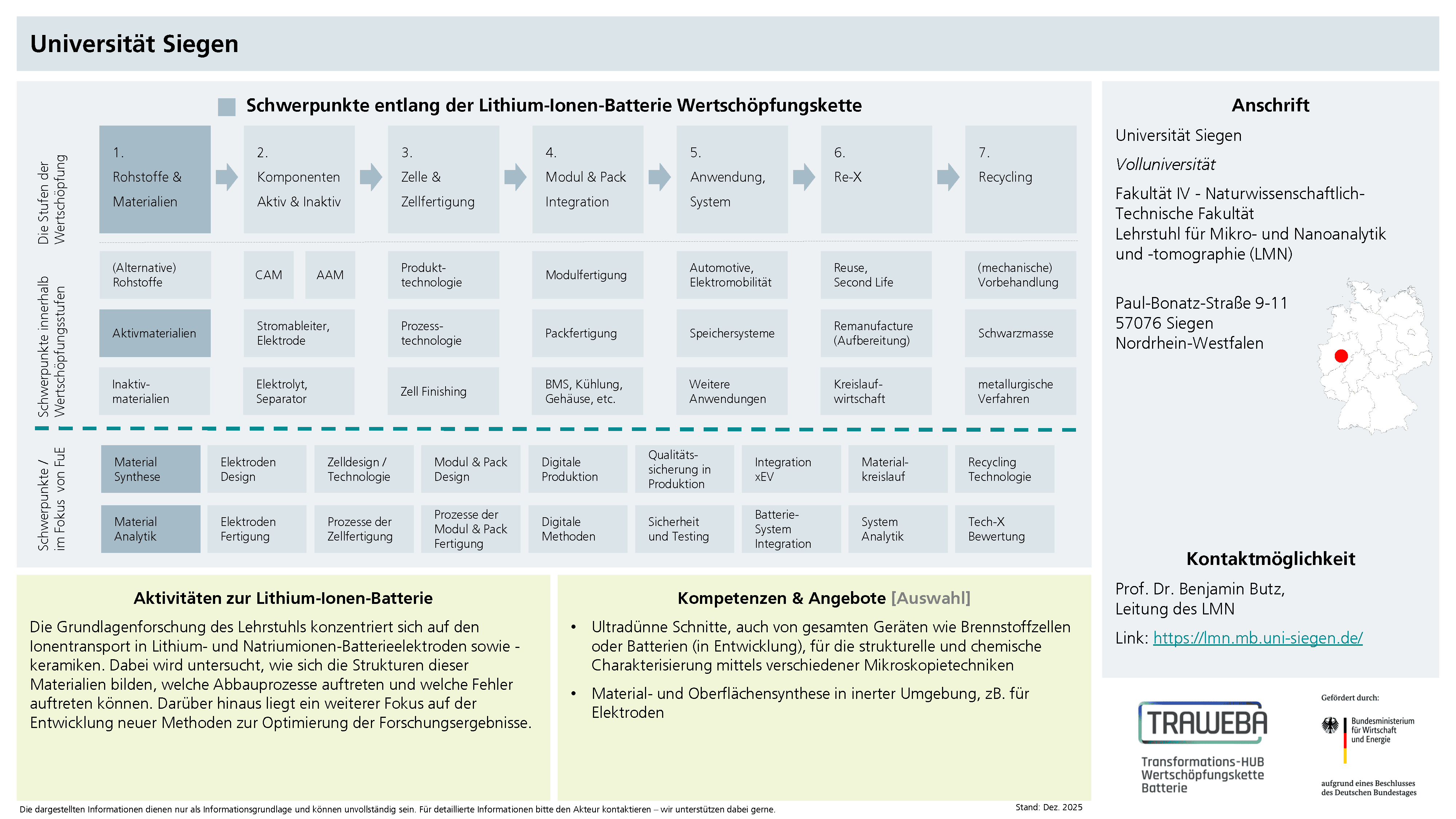 Die Grundlagenforschung der Universität Siegen konzentriert sich im Lehrstuhl Mikro- und Nanoanalytik und -tomographie (Siegen) auf den Ionentransport in Lithium- und Natriumionen-Batterieelektroden sowie -keramiken. Dabei wird untersucht, wie sich die Strukturen dieser Materialien bilden, welche Abbauprozesse auftreten und welche Fehler auftreten können. Darüber hinaus liegt ein weiterer Fokus auf der Entwicklung neuer Methoden zur Optimierung der Forschungsergebnisse.