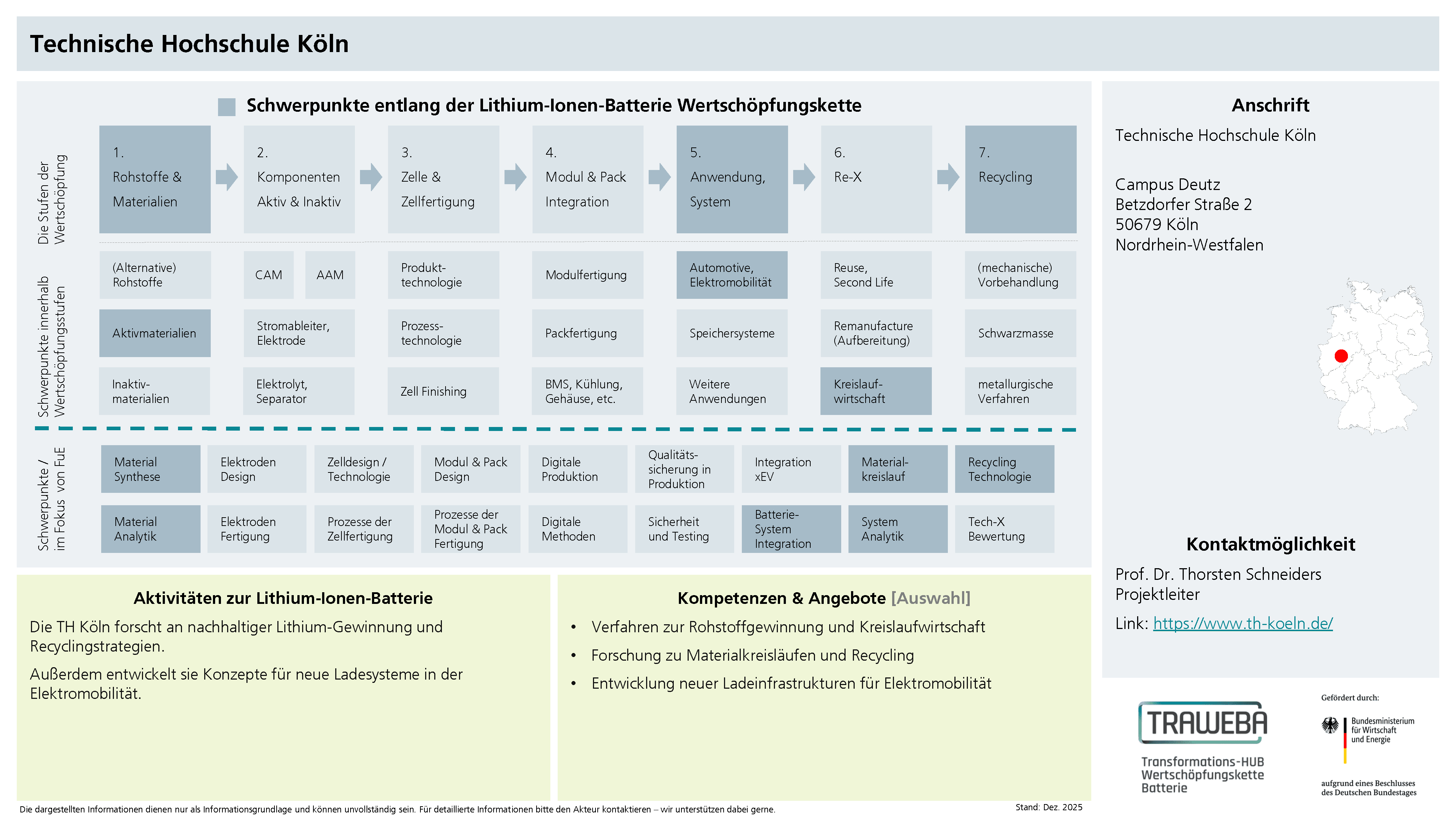 Die TH Köln forscht an nachhaltiger Lithium-Gewinnung und Recyclingstrategien. Außerdem entwickelt die Hochschule Konzepte für neue Ladesysteme in der Elektromobilität.