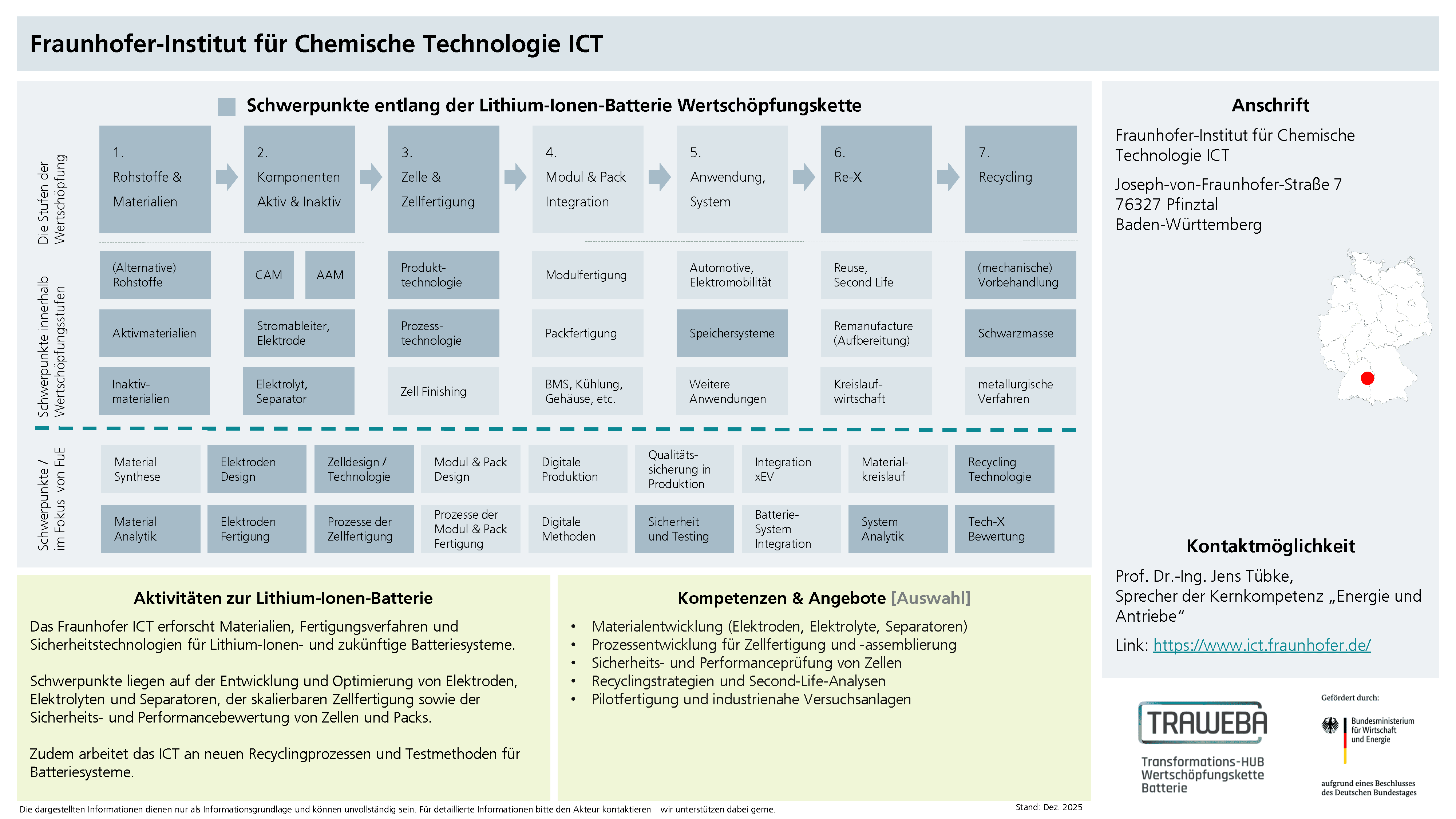Am Fraunhofer-Institut für Chemische Technologie ICT wird ein breites Spektrum an Forschungs- und Entwicklungsaktivitäten in den Bereichen elektrochemische Energiespeicherung und -wandlung sowie elektrochemische Sensorik und Analysensysteme abgedeckt. Im Batteriebereich beschäftigt sich das Fraunhofer ICT mit Sicherheits- und Alterungsuntersuchungen bis zur Modulebene, Gasanalytik und weiterer spezieller (Operando-)Analysemethoden auf Zell- und Systemebene. Die Entwicklung neuer Batterien wie Festkörper-, Redox-Flow- und Na-Batterien sowie das Forschungs- und Testdatenmanagement gehören ebenso zum Portfolio.