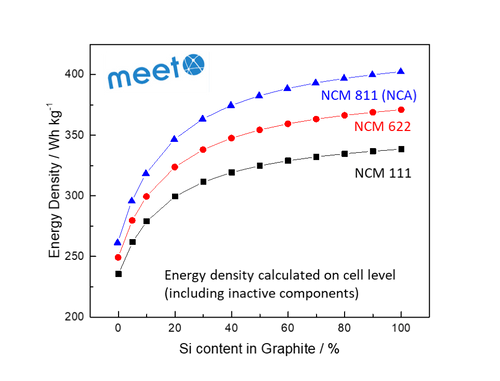 Das allgemeine Ziel der am MEET durchgeführten Arbeitspakete ist die Erhöhung der zyklischen Lebensdauer der Hochenergiezelle mit Kohlenstoff-Silicium-Anoden. Die Arbeitsziele bauen sich entlang der inhaltlichen Projektstruktur auf und zielen auf Basis der Materialentwicklung (C/Si-Komposite, Binder, Separator, Elektrolyt) sowie der Entwicklung einer technologisch, wirtschaftlich und ökologisch überlegenen Material- und Prozesstechnik auf die Entwicklung einer innovativen Hochenergiezelle (NCM622 vs. C/Si) ab.