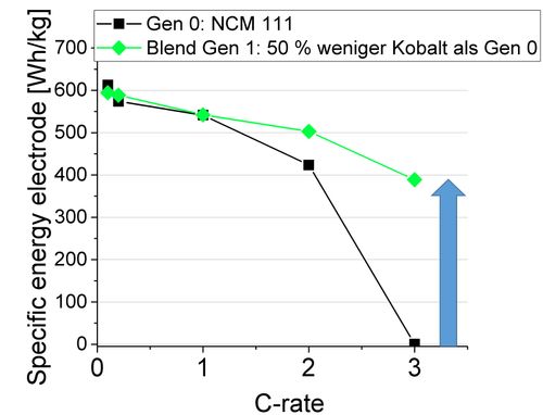 Hier wird insbesondere auf der Kathoden-Seite gezielt die Vermischung mehrerer Materialien zu sogenannten Blends untersucht. Durch das Vermischen sollen sich die positiven Eigenschaften der reinen Materialien ergänzen. Mit Blends aus Schichtoxiden mit hoher Energiedichte und Olivinen (LiMPO4 M = Fe/Mn) von Johnsson Matthey, die eine schnelle Kinetik aufweisen, soll eine Erhöhung der Strombelastbarkeit bei gleichbleibender Energiedichte erreicht werden. Außerdem soll der Anteil des bedenklichen Cobalts in der Kathode reduziert werden. Unterschiedliche Materialien stellen jedoch unterschiedliche Anforderungen an den Herstellungsprozess und sind in verschiedenen Potentialbereichen aktiv. Um die Möglichkeiten neuartiger Materialkombinationen umfassend zu verstehen, werden Rezepturen, Herstellungsprozesse, Elektrodenparameter und Betriebsparameter untersucht.