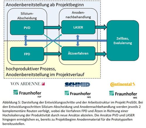 Die einzelnen Arbeitspakete sind inhaltlich so aufgestellt, dass die gesamte Prozesskette von Elektrodenfertigung über Anodennachbehandlung bis zum Zellbau bzw. deren Evaluierung von Projektbeginn an mit bestehenden Prozessen realisiert werden kann. Dadurch ist eine schnelle Analyse und zielgerichtete Anpassung der Zelltechnologie mit hoher volumetrischer Energiedichte mit einer hochkapazitiven Siliciumanode gegeben. Simultan erfolgt die Entwicklung hochproduktiver Prozesse für die wirtschaftliche Herstellung der Siliciumanoden, die durch die zuvor erarbeiteten Erkenntnisse in kurzer Zeit in die Zelltechnologie integriert werden können.