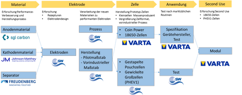 Alle Materialien und Prozesse werden daran gemessen, ob sie in einer solchen großen Produktion verwandt werden können. Dabei helfen die bestehenden Herstellungslinien „Forschungsproduktionslinie“ (FPL) beim ZSW (Baugröße PHEV-1) und „Forschungsversuchsanlagen“ bei VMB (Baugröße 18650 bzw. 21700). Beide Linien werden im Rahmen dieses Projekts genutzt. An ihnen können auch die wirtschaftlichen Aspekte erforscht werden. Ein Business-Plan wird für die Herstellung entworfen, nach dem die Wirtschaftlichkeit einer hochskalierten Großfertigung beurteilt wird.